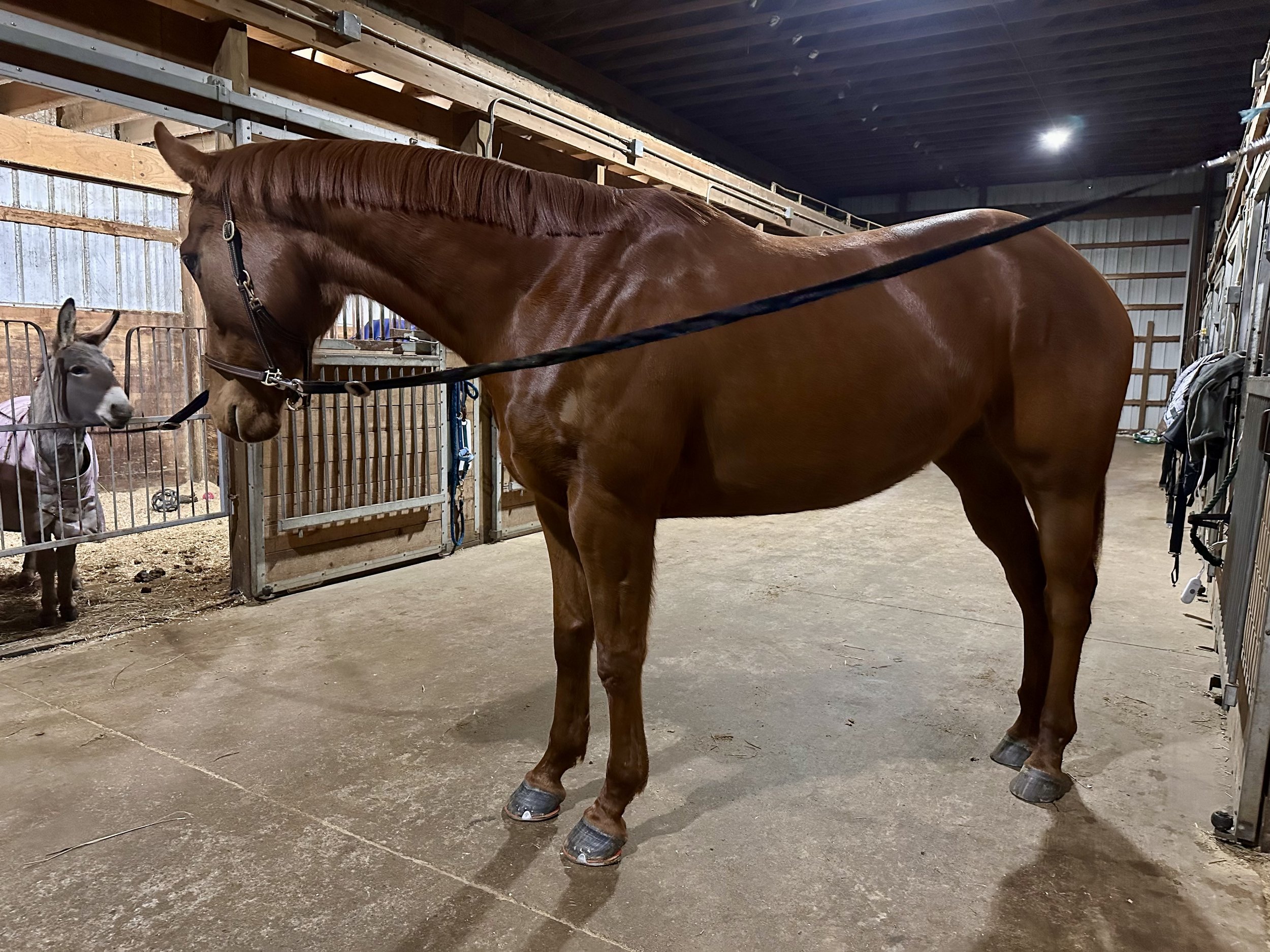 She falls asleep in the cross ties, begs for affection, is clean and tidy in her stall, and generally is a joy to have around. She gives excellent hugs and kisses. She is wonderful with people and other horses, and we have no doubt she would make a phenomenal addition to any sporthorse breeding program looking to influence their foals with well-mannered, sound, AA-friendly, high-quality Thoroughbred blood. Not to mention, her color is absolutely stunning.