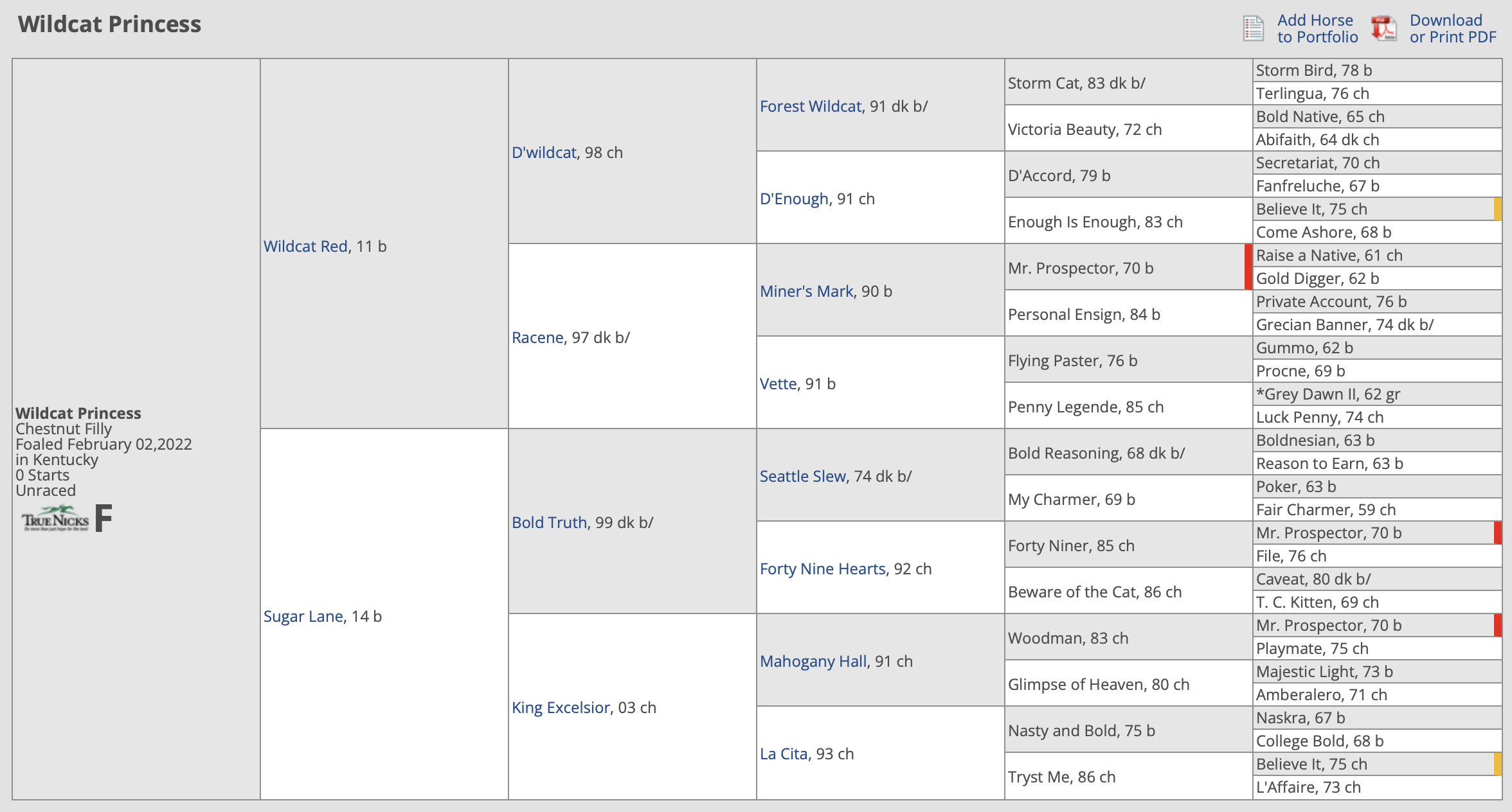 Her pedigree is STAR-STUDDED, granddaughter to the revered stallions D’Wildcat and Bold Truth, with Storm Cat and Seattle Slew/Bold Reasoning only a few generations back.